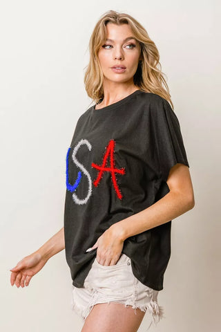 This fashion oversized T-shirt features a patriotic graphic design with red, white, and blue elements on a charcoal gray base. Made from soft cotton blend fabric for all-day comfort, it offers a relaxed fit perfect for casual wear. The vintage-inspired distressed print adds character while the classic round neckline and short sleeves provide timeless appeal. Ideal for expressing American pride or adding a casual cool vibe to any outfit.