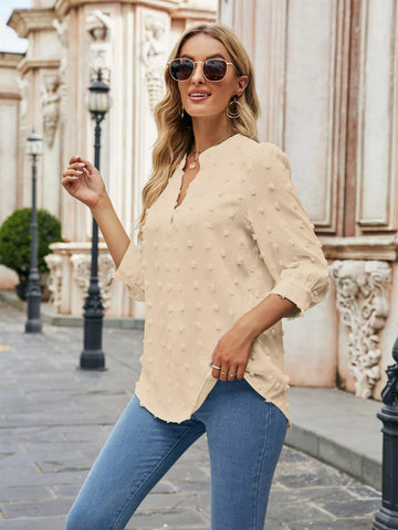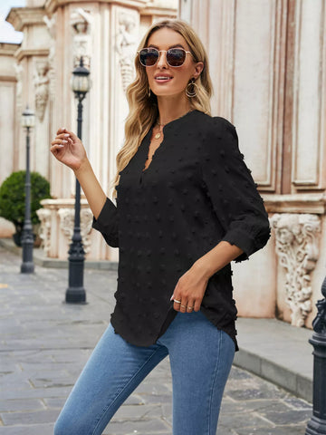 Swiss Dot Notched 3/4 Sleeve Blouse