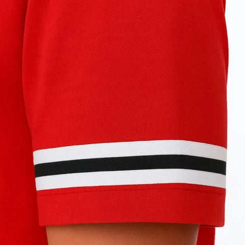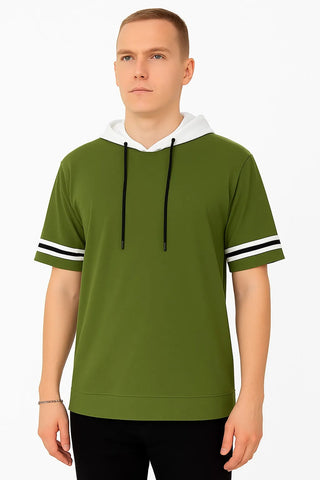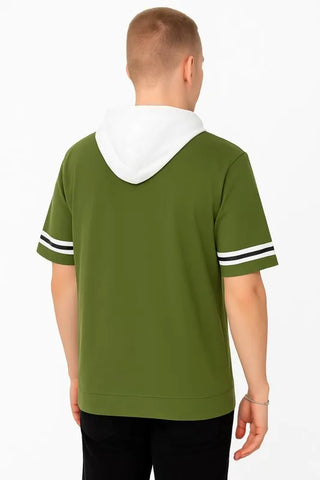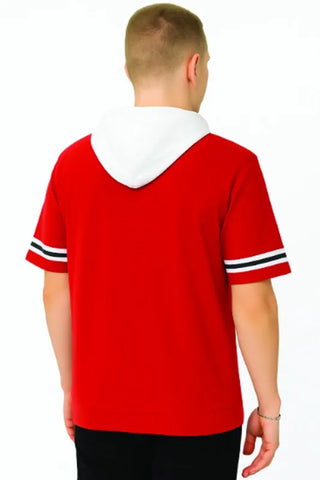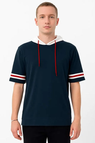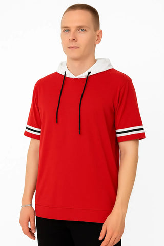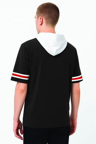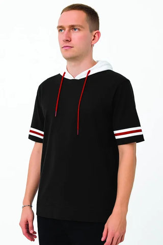 This contemporary short-sleeve hoodie combines classic comfort with modern sporty aesthetics. The piece includes an adjustable hood with contrasting red drawstrings for personalized fit and style accent. Perfect for casual wear, gym sessions, or layering, this hoodie offers versatile styling options with its relaxed fit and breathable construction. The timeless black colorway ensures easy coordination with any wardrobe while the striped detailing adds a fresh, athletic-inspired touch.