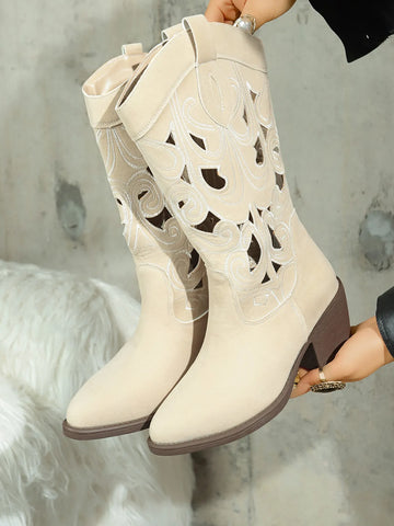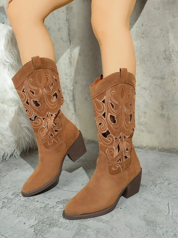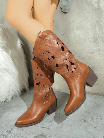 Western Cutout Pattern Block Heel Boots