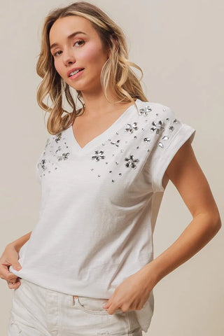 The BiBi Slub Jersey Rhinestone V Neck Top destined to impress, and priced at only $35.20, for a limited time.