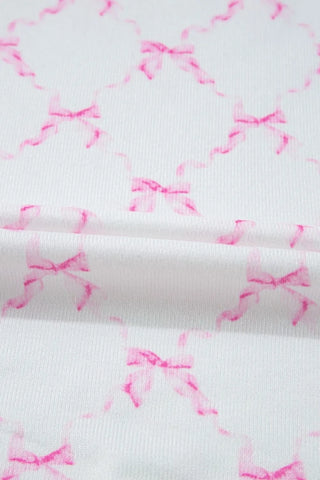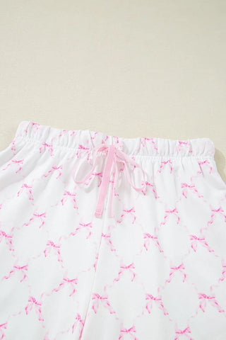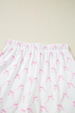 Bow Print Lettuce Trim Round Neck Top and Shorts Lounge Set