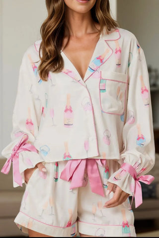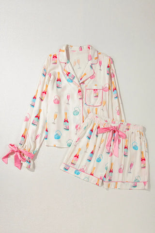 Bow Printed Collared Neck Top and Drawstring Shorts Lounge Set