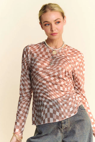Davi & Dani Checker Board Mesh Long Sleeve Layering Top