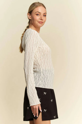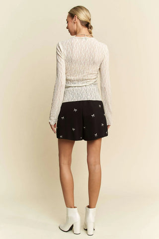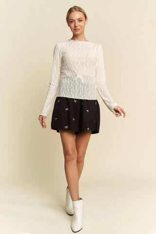 Davi & Dani Long Sleeve Sheer Small Embroidered Bows Lace Top