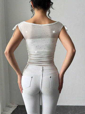 Glitter Stars Sheer Mesh Ruched Crop Top