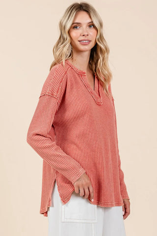 This long sleeve top is crafted from a unique mineral wash waffle knit fabric, giving it a stylish and textured look. The V-neck design adds a touch of femininity to the casual silhouette. Perfect for layering or wearing on its own, this top is versatile and easy to style. Elevate your everyday outfits with this trendy and comfortable waffle knit top!