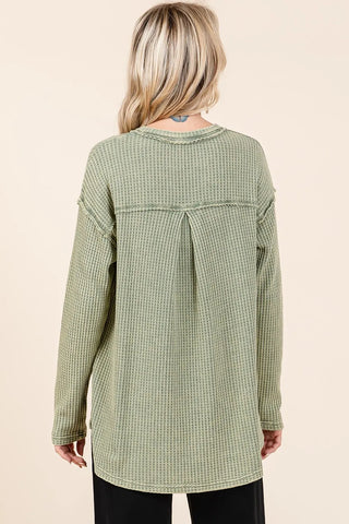 This long sleeve top is crafted from a unique mineral wash waffle knit fabric, giving it a stylish and textured look. The V-neck design adds a touch of femininity to the casual silhouette. Perfect for layering or wearing on its own, this top is versatile and easy to style. Elevate your everyday outfits with this trendy and comfortable waffle knit top!