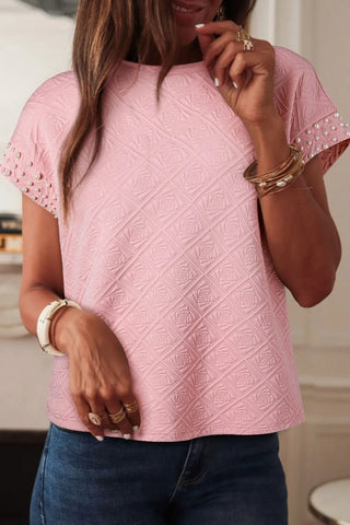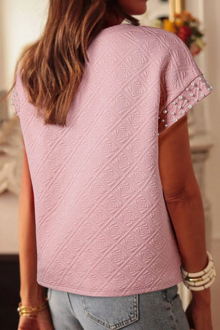 Pearl Embellished Flower Textured T Shirt