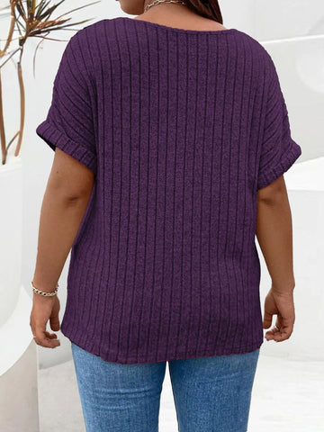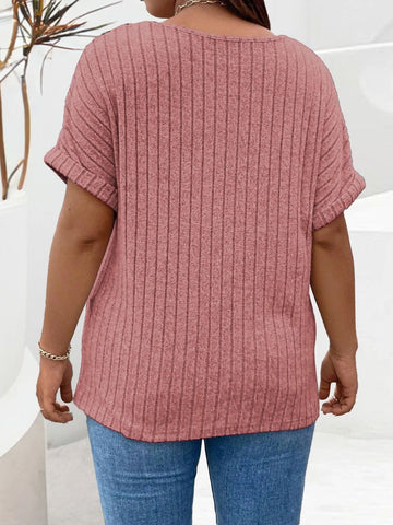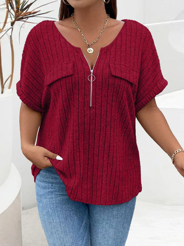 Plus Size Ribbed Half Zip Relaxed Fit T-Shirt