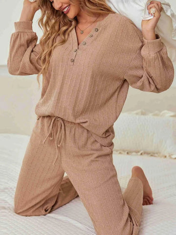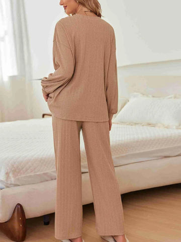 Ribbed Knit Top and Pants Lounge Set with Button Detail