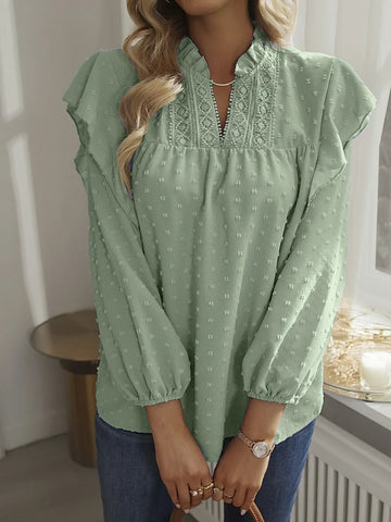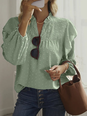 The Swiss Dot Ruffled Long Sleeve Blouse is the product you didn't think you need, but once you have it, something you won't want to live without.