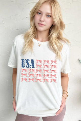 Life is too short to live without the USA Flag Bow Knot Print Round Neck T Shirt. Be happy. Be Content. Be Satisfied.